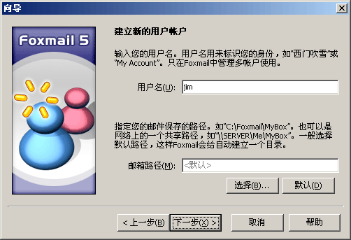 - 配置Foxmail,创建邮箱的时候,邮箱路径选择 “默认” 即可,或者直接指向虚拟硬盘。